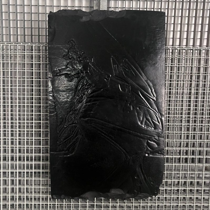 Natural asphalt is among the oldest materials used by humans, comparable to clay in its early availability and application. Occurring naturally in various regions worldwide, this oil based residue could be heated and employed in a wide range of practices. It was used by Neanderthals as an adhesive for attaching spearheads and is referenced several times in the Bible. It played a central role as a construction material, glue, and boat sealant in ancient Mesopotamia. Natural asphalt accompanied humans from the emergence of the earliest urban cultures. Today, asphalt is largely perceived as industrialised, toxic, and artificial. The edition Horizontal Landfill examines this shifted relationship between humans and asphalt, recalling the foundational role of a material that has become largely disregarded. The cast plates are made entirely from natural asphalt, reasserting its historical continuity.